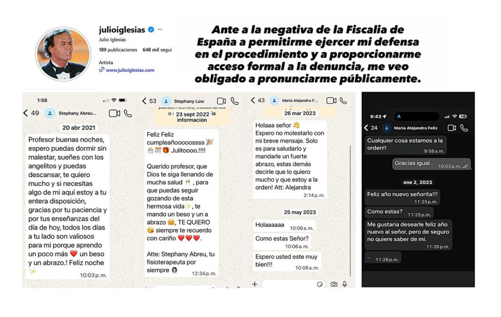 La publicación de los mensajes forma parte de la estrategia de defensa de Iglesias, luego de que la Fiscalía de la Audiencia Nacional de España le negara el acceso formal a la denuncia presentada en su contra. En un comunicado difundido en redes sociales, el cantante afirmó que Instagram es, por el momento, “el único medio” que le permite ejercer su derecho a la defensa.